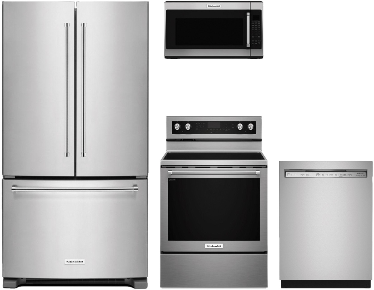 KitchenAid® 4 Piece Stainless Steel Kitchen Package with a French door refrigerator, free standing electric range, built in dishwasher and over the range microwave.Read More